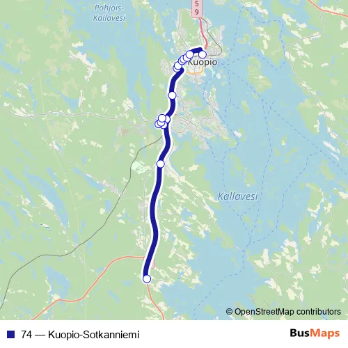 The first stop of the 74 bus route is Humalajoki (Kuopio) P and the last stop is Linja-autoasema saapuvat. 74 (Kuopio-Sotkanniemi) is operational during arkipäivisin.
