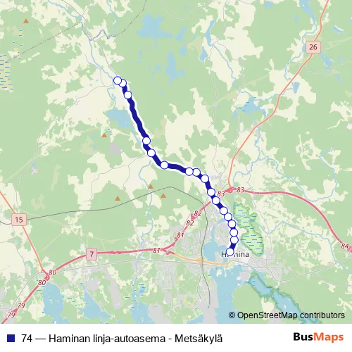 Click here to view the nearest 74 - Haminan linja-autoasema - Metsäkylä bus stop.