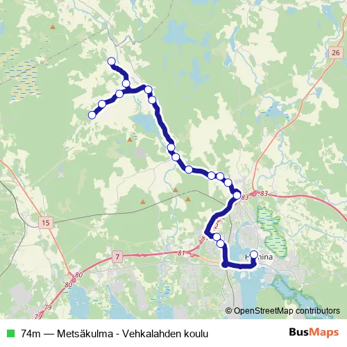 The first stop of the 74m bus route is Metsäkulma, Sydänmaantie th E and the last stop is Hamina LA-as Päätepysäkki. 74m (Metsäkulma - Vehkalahden koulu) is operational during arkipäivisin.