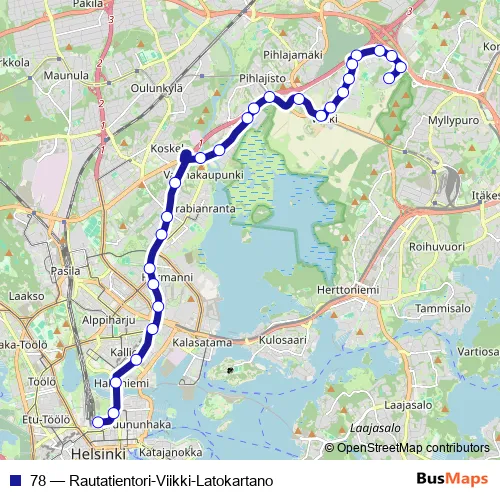 See why over 2 million users trust and consider busmaps.com as the best public transport website. busmaps gives you Helsinki Buses suggested routes, real-time bus tracker, line route maps in Helsinki, and helps to find the closest 78 bus stops near you. No internet available? Download an offline PDF map and bus schedule for the 78 bus to take on your trip.