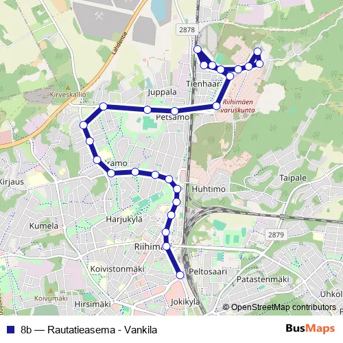The first stop of the 8b bus route is Rautatieasema A and the last stop is Varuskunta. 8b (Rautatieasema - Vankila) is operational during arkipäivisin.