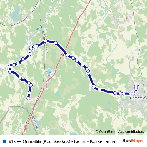 The first stop of the 91k bus route is Orimattilan koulukeskus (kääntöpaikka) and the last stop is Hennan bulevardi I. 91k (Orimattila (Koulukeskus) - Keituri - Kokki-Henna) is operational during arkipäivisin.