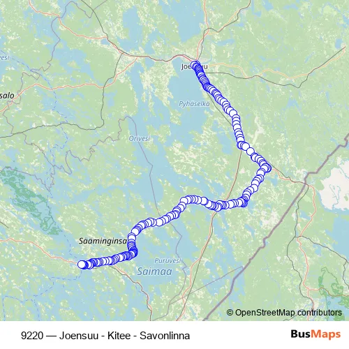 The first stop of the 9220 bus route is Joensuu and the last stop is Savonlinnan linja-autoasema. 9220 (Joensuu - Kitee - Savonlinna) is operational during joka päivä.