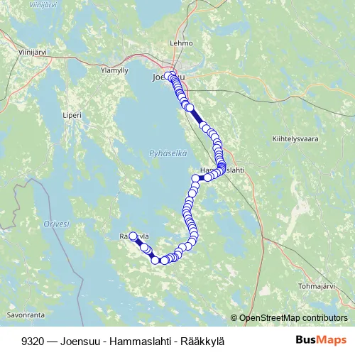 The first stop of the 9320 bus route is Joensuu and the last stop is Rääkkylä keskusta. 9320 (Joensuu - Hammaslahti - Rääkkylä) is operational during joka päivä.