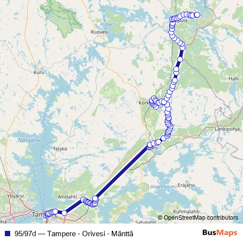 Click here to view the nearest 95/97d - Tampere - Orivesi - Mänttä bus stop.