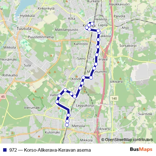 The first stop of the 972 bus route is Maakotkanpolku and the last stop is Keravan asema. 972 (Korso-Alikerava-Keravan asema) is operational during arkipäivisin.