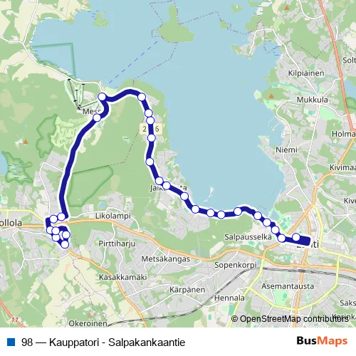 The first stop of the 98 bus route is Kauppatori D and the last stop is Salpakankaantie 1 E. 98 (Kauppatori - Salpakankaantie) is operational during joka päivä.