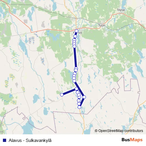 Additional information: Alavus - Sulkavankylä has 21 stops and the total trip duration for this route is approximately 30 minutes.