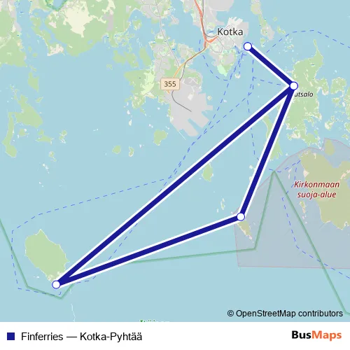 The first stop of the Finferries ferry route is Kotka and the last stop is Kotka. Finferries (Kotka-Pyhtää) is operational during viikonloppuisin.