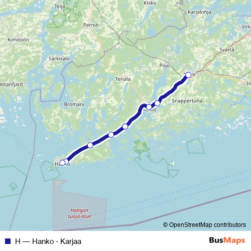 The first stop of the H rail route is Karjaa and the last stop is Hanko. H (Hanko - Karjaa) is operational during joka päivä.