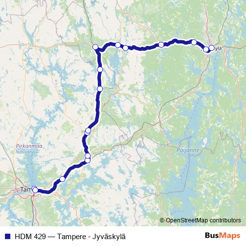 The first stop of the HDM 429 rail route is Tampere and the last stop is Jyväskylä. HDM 429 (Tampere - Jyväskylä) is operational during joka päivä.