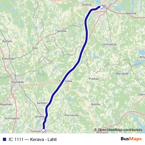 See why over 2 million users trust and consider busmaps.com as the best public transport website. busmaps gives you Kerava Rail Services suggested routes, real-time bus tracker, line route maps in Kerava, and helps to find the closest IC 1111 rail stops near you. No internet available? Download an offline PDF map and bus schedule for the IC 1111 rail to take on your trip.