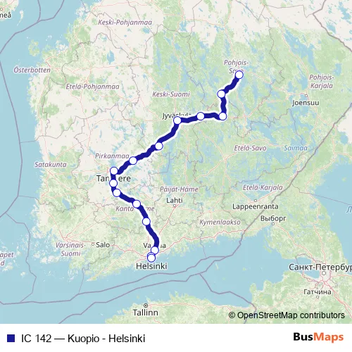 The first stop of the IC 142 rail route is Kuopio and the last stop is Helsinki. IC 142 (Kuopio - Helsinki) is operational during joka päivä.