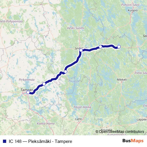 The first stop of the IC 148 rail route is Pieksämäki and the last stop is Tampere. IC 148 (Pieksämäki - Tampere) is operational during viikonloppuisin.