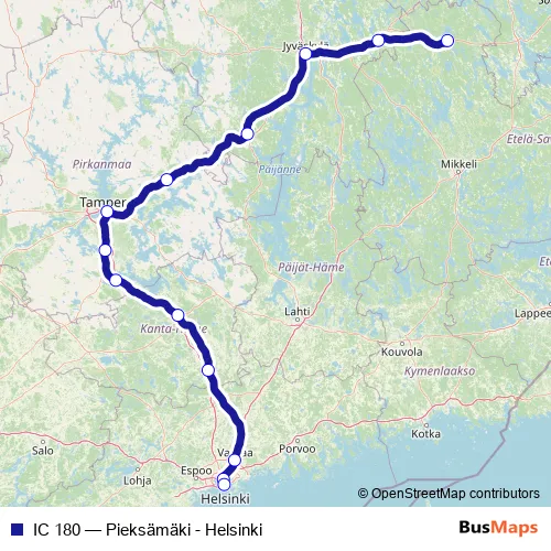 The first stop of the IC 180 rail route is Pieksämäki and the last stop is Helsinki. IC 180 (Pieksämäki - Helsinki) is operational during joka päivä.