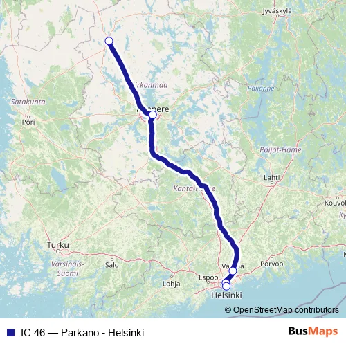The first stop of the IC 46 rail route is Parkano and the last stop is Helsinki. IC 46 (Parkano - Helsinki) is operational during joka päivä.