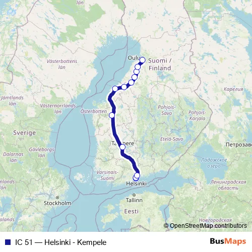 The first stop of the IC 51 rail route is Helsinki and the last stop is Kempele. IC 51 (Helsinki - Kempele) is operational during joka päivä.