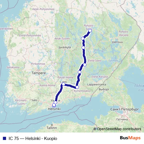 The first stop of the IC 75 rail route is Helsinki and the last stop is Kuopio. IC 75 (Helsinki - Kuopio) is operational during joka päivä.