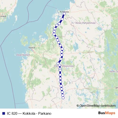 The first stop of the IC 820 rail route is Kokkola and the last stop is Parkano. IC 820 (Kokkola - Parkano) is operational during joka päivä.