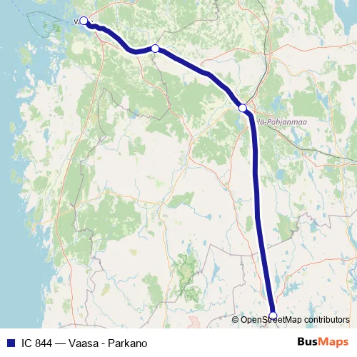 The first stop of the IC 844 rail route is Vaasa and the last stop is Parkano. IC 844 (Vaasa - Parkano) is operational during joka päivä.