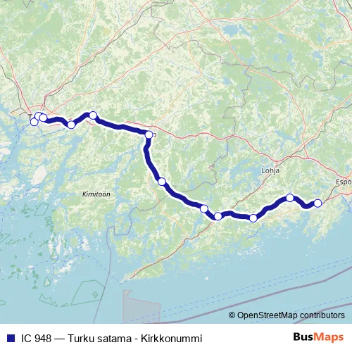 The first stop of the IC 948 rail route is Turku satama and the last stop is Kirkkonummi. IC 948 (Turku satama - Kirkkonummi) is operational during joka päivä.