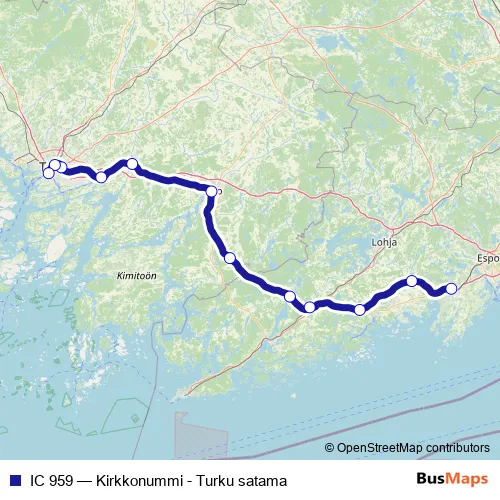 The first stop of the IC 959 rail route is Kirkkonummi and the last stop is Turku satama. IC 959 (Kirkkonummi - Turku satama) is operational during joka päivä.