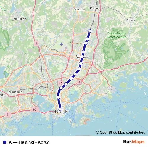 See why over 2 million users trust and consider busmaps.com as the best public transport website. busmaps gives you Helsinki Rail Services suggested routes, real-time bus tracker, line route maps in Helsinki, and helps to find the closest K rail stops near you. No internet available? Download an offline PDF map and bus schedule for the K rail to take on your trip.
