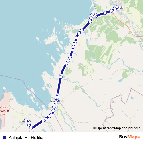 The first stop of the Kalajoki E - Hollitie L bus route is Kalajoki E and the last stop is Hollitie L. Kalajoki E - Hollitie L (Kalajoki E - Hollitie L) is operational during arkipäivisin.