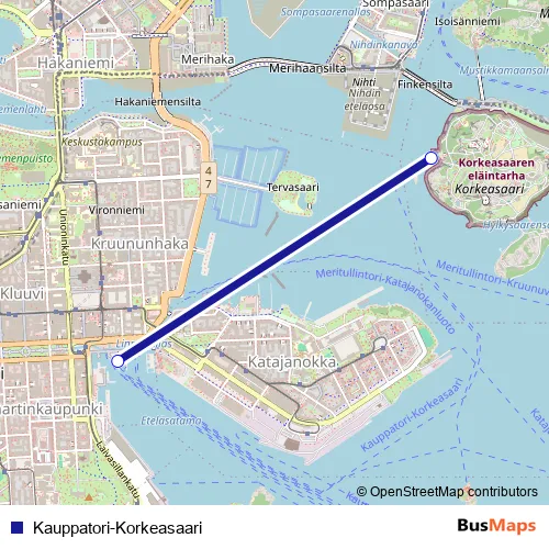 See why over 2 million users trust and consider busmaps.com as the best public transport website. busmaps gives you Helsinki Ferries suggested routes, real-time bus tracker, line route maps in Helsinki, and helps to find the closest Kauppatori-Korkeasaari ferry stops near you. No internet available? Download an offline PDF map and bus schedule for the Kauppatori-Korkeasaari ferry to take on your trip.