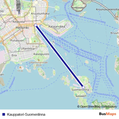 See why over 2 million users trust and consider busmaps.com as the best public transport website. busmaps gives you Helsinki Ferries suggested routes, real-time bus tracker, line route maps in Helsinki, and helps to find the closest Kauppatori-Suomenlinna ferry stops near you. No internet available? Download an offline PDF map and bus schedule for the Kauppatori-Suomenlinna ferry to take on your trip.
