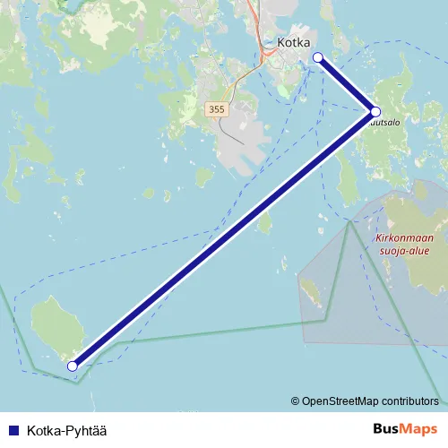 The first stop of the Kotka-Pyhtää ferry route is Kuusinen (Kotka) and the last stop is Kaunissaari. Kotka-Pyhtää is operational during joka päivä.