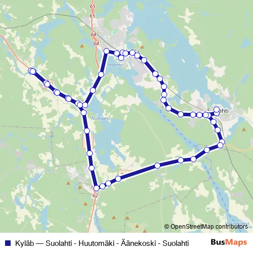 The first stop of the Kyläb bus route is Suolahti las and the last stop is Ostokeskus P. Kyläb (Suolahti - Huutomäki - Äänekoski - Suolahti) is operational during arkipäivisin.
