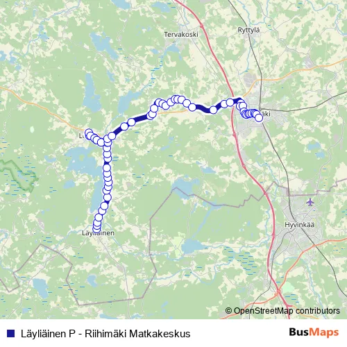 The first stop of the Läyliäinen P - Riihimäki Matkakeskus bus route is Läyliäinen P and the last stop is