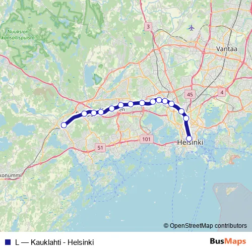 See why over 2 million users trust and consider busmaps.com as the best public transport website. busmaps gives you Helsinki Rail Services suggested routes, real-time bus tracker, line route maps in Helsinki, and helps to find the closest L rail stops near you. No internet available? Download an offline PDF map and bus schedule for the L rail to take on your trip.