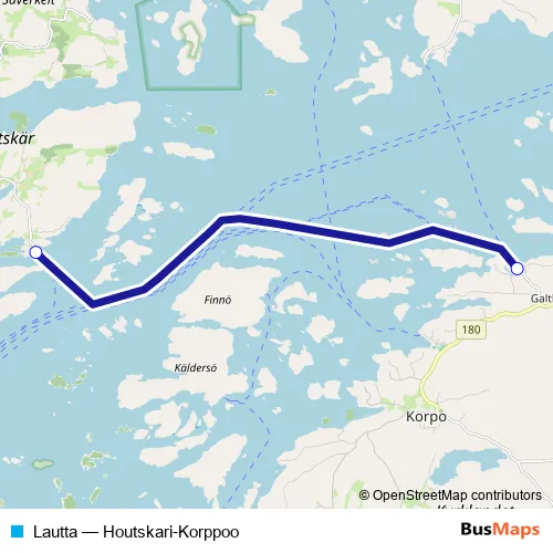 The first stop of the Lautta ferry route is Kittuis lauttaranta E and the last stop is Galtbyn laituri. Lautta (Houtskari-Korppoo) is operational during joka päivä.