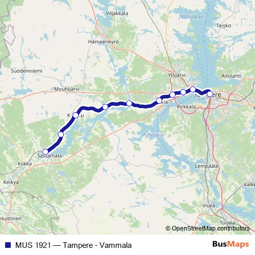 The first stop of the MUS 1921 rail route is Tampere and the last stop is Vammala. MUS 1921 (Tampere - Vammala) is operational during joka päivä.
