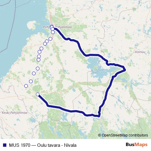 The first stop of the MUS 1970 rail route is Oulu tavara and the last stop is Nivala. MUS 1970 (Oulu tavara - Nivala) is operational during joka päivä.