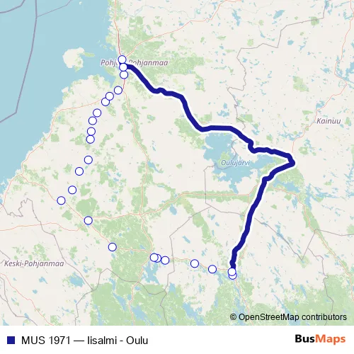 The first stop of the MUS 1971 rail route is Iisalmi and the last stop is Oulu. MUS 1971 (Iisalmi - Oulu) is operational during joka päivä.