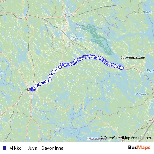 The first stop of the Mikkeli - Juva - Savonlinna bus route is Mikkeli Matkakeskus, saapuvat and the last stop is