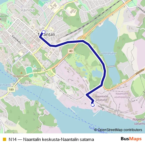 The first stop of the N14 bus route is Naantalin satama and the last stop is Naantali. N14 (Naantalin keskusta-Naantalin satama) is operational during joka päivä.