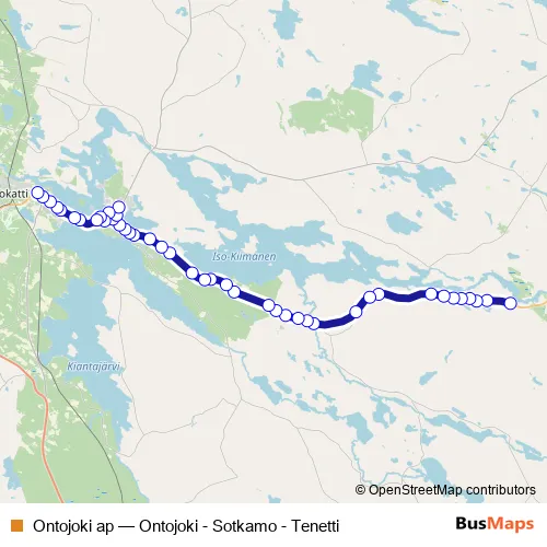 The first stop of the Ontojoki ap bus route is Raivio L and the last stop is Tenetin koulu. Ontojoki ap (Ontojoki - Sotkamo - Tenetti) is operational during arkipäivisin.