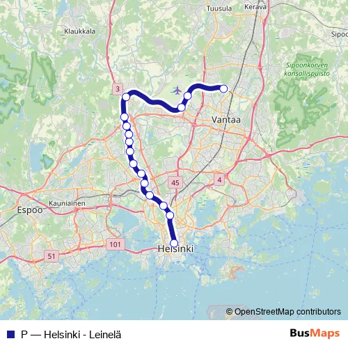 The first stop of the P rail route is Helsinki and the last stop is Leinelä. P (Helsinki - Leinelä) is operational during joka päivä.