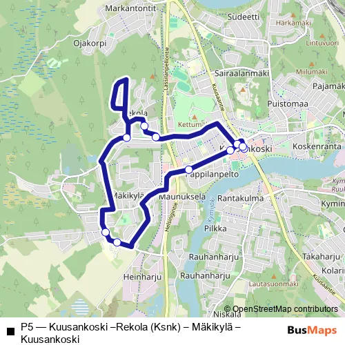 The first stop of the P5 bus route is Kuusankoski Kuusaantie P and the last stop is Kuusankoski Kuusaantie E. P5 (Kuusankoski –Rekola (Ksnk) – Mäkikylä – Kuusankoski) is operational during joka päivä.