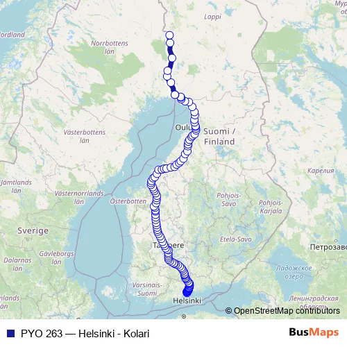 The first stop of the PYO 263 rail route is Helsinki and the last stop is Kolari. PYO 263 (Helsinki - Kolari) is operational during joka päivä.