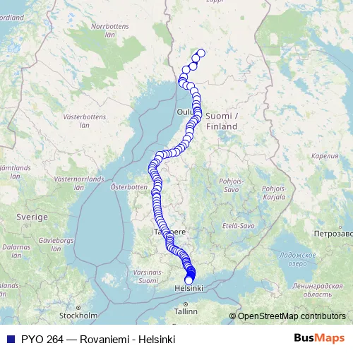 The first stop of the PYO 264 rail route is Rovaniemi and the last stop is Helsinki. PYO 264 (Rovaniemi - Helsinki) is operational during joka päivä.
