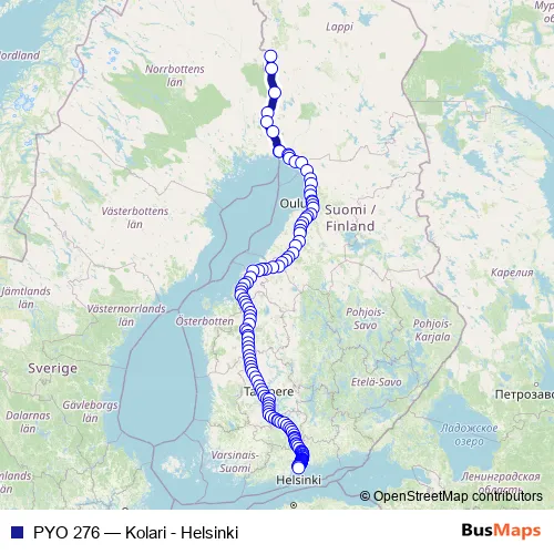 The first stop of the PYO 276 rail route is Kolari and the last stop is Helsinki. PYO 276 (Kolari - Helsinki) is operational during joka päivä.