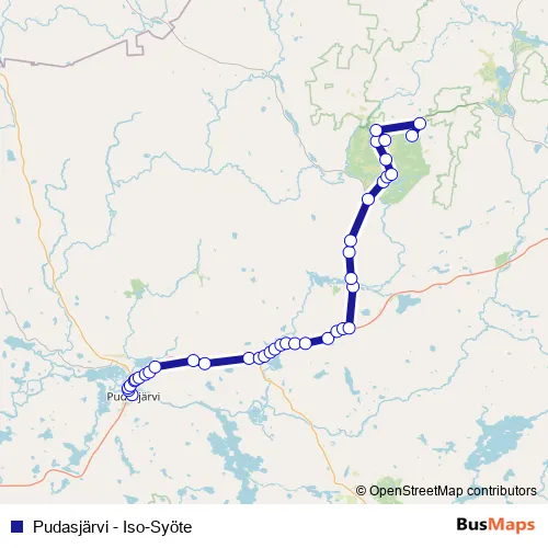 The first stop of the Pudasjärvi - Iso-Syöte bus route is Pudasjärvi and the last stop is