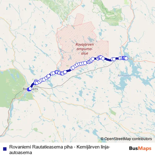 Additional information: Rovaniemi Rautatieasema piha - Kemijärven linja-autoasema has 63 stops and the total trip duration for this route is approximately 75 minutes.