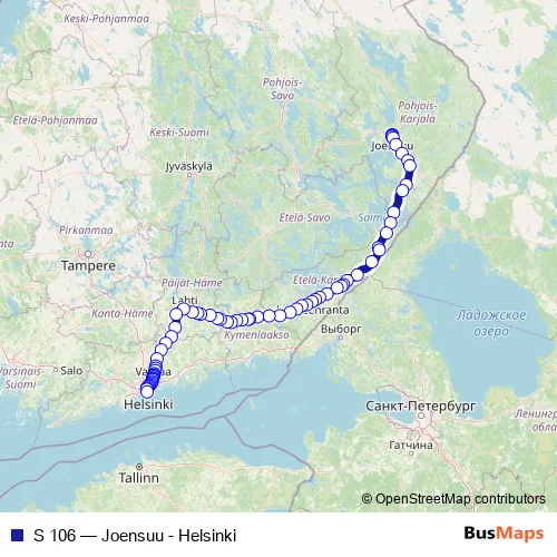 The first stop of the S 106 rail route is Joensuu and the last stop is Helsinki. S 106 (Joensuu - Helsinki) is operational during joka päivä.
