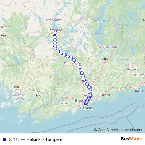 The first stop of the S 171 rail route is Helsinki and the last stop is Tampere. S 171 (Helsinki - Tampere) is operational during joka päivä.
